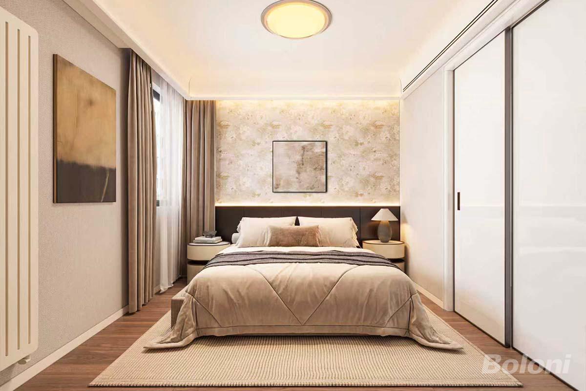 采用极简奶咖配色,艺术背景墙提升空间质感,无主灯营造柔和氛围,通顶衣柜优化收纳,打造舒适通透、高级感十足的主卧休憩区。