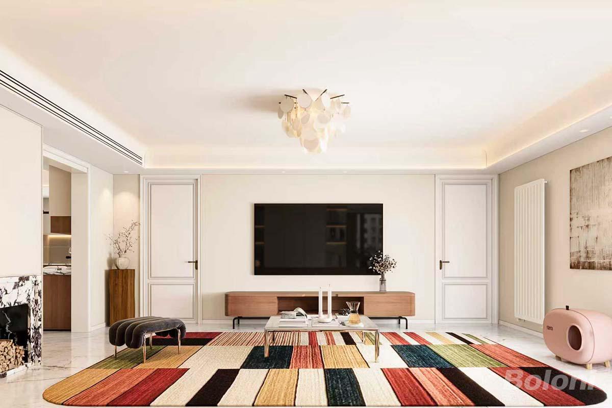 采用法式奶咖配色,石膏线门垛提升精致度,彩色地毯点亮空间,悬浮电视柜优化收纳,打造通透舒适、氛围感拉满的现代法式客厅。