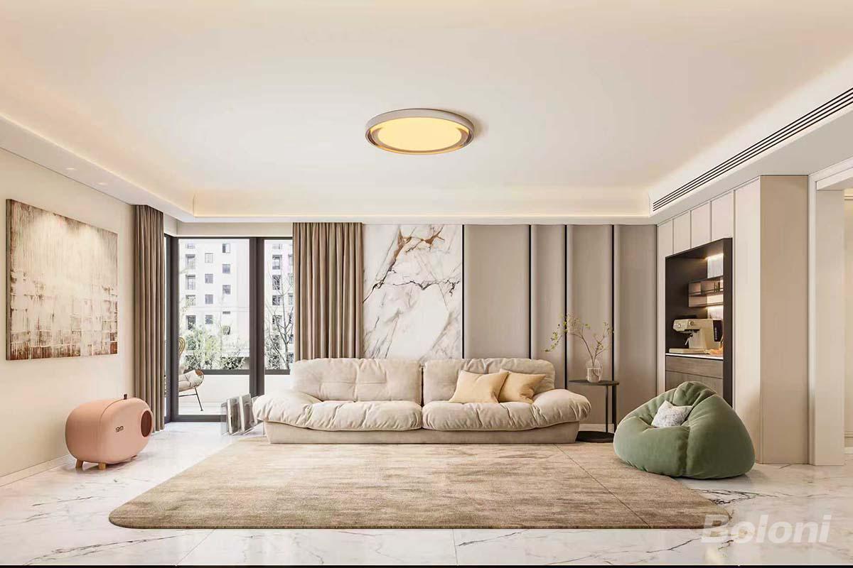 以高级奶油调为主,大理石背景墙彰显质感。悬浮吊顶搭配无主灯照明,流线型软装点缀,打造大气静谧、温馨治愈的家庭核心社交区。