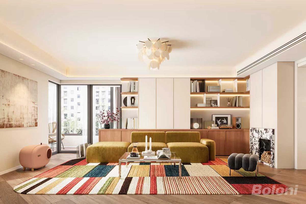 以温润奶白为基底,原木柜体混搭牛油果绿沙发,彩色地毯点亮空间。悬浮书柜兼具收纳与展示,打造温馨治愈、色彩灵动的家庭核心区。