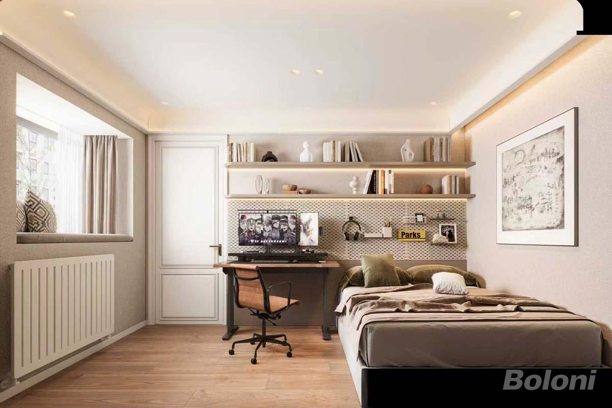 以温润奶咖为基调,洞洞板+层架打造灵活收纳,床桌一体化布局,兼顾睡眠、办公与展示,无主灯营造柔和氛围,打造实用通透、适配成长的多功能空间。