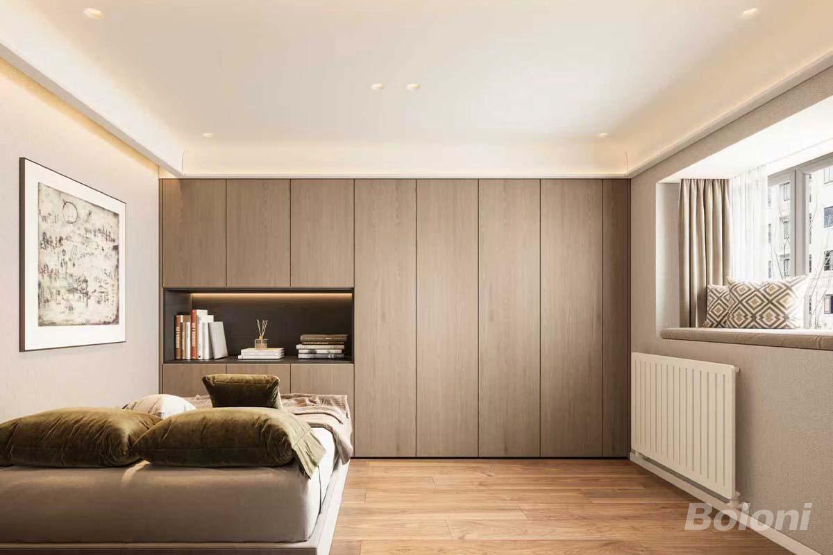 以温润原木为基调,通顶衣柜最大化收纳,内嵌开放格打造展示区,无主灯营造柔和氛围,打造静谧松弛、实用通透的多功能休憩空间。