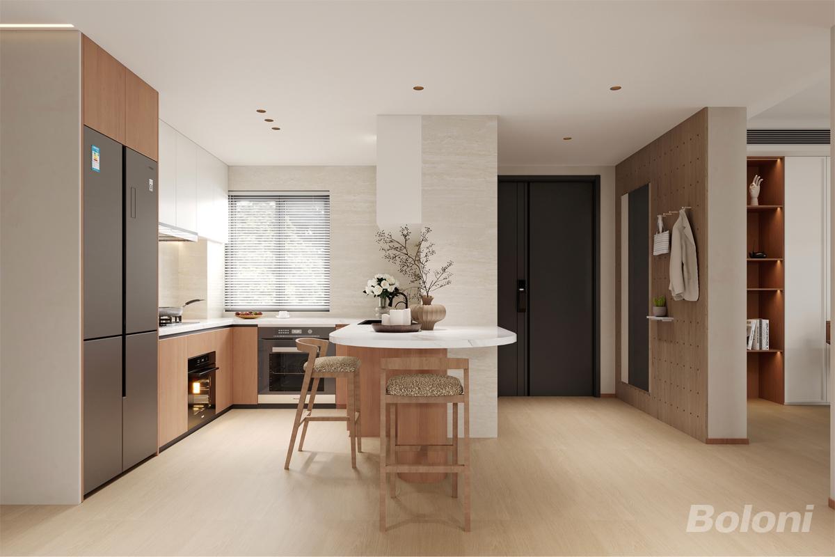 木色橱柜的温润、石英石台面的质感、洞石中岛的肌理、洞洞板的通透,通过材质层次丰富空间质感,契合中古风的自然质朴