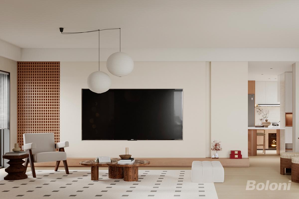 客厅电视墙采用悬浮式 + 分段式设计。左侧保留原木格栅元素,增加通透感与呼吸感;右侧为大面积素色墙面,中间内嵌电视,符合现代审美