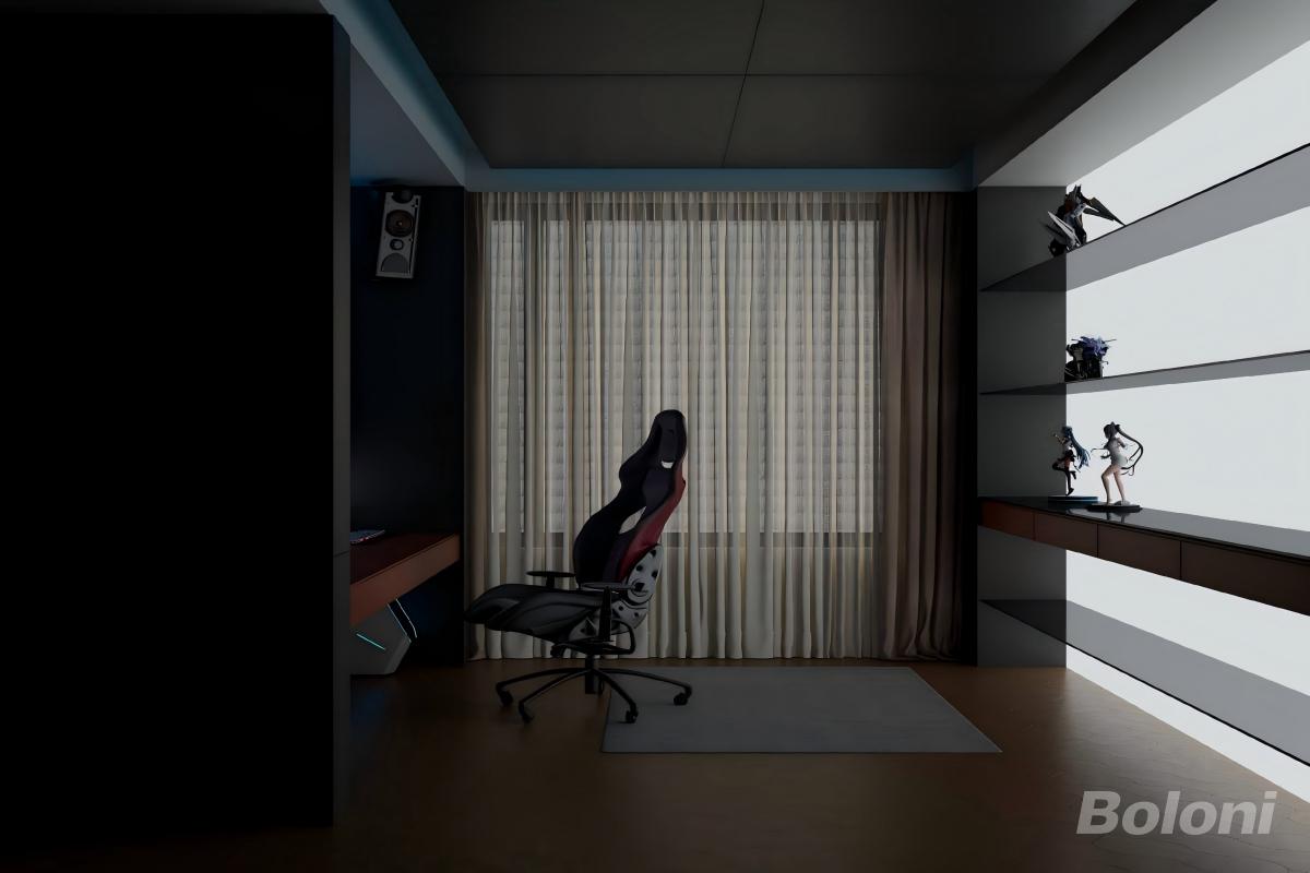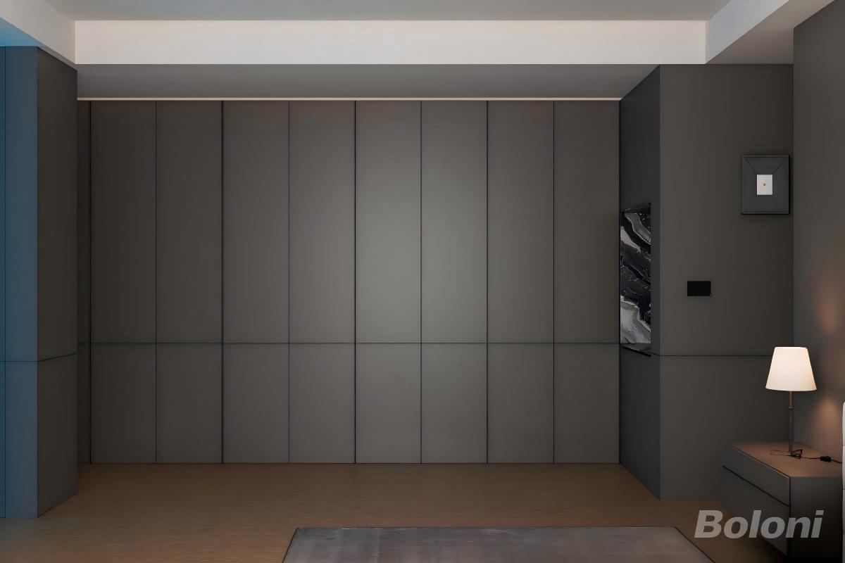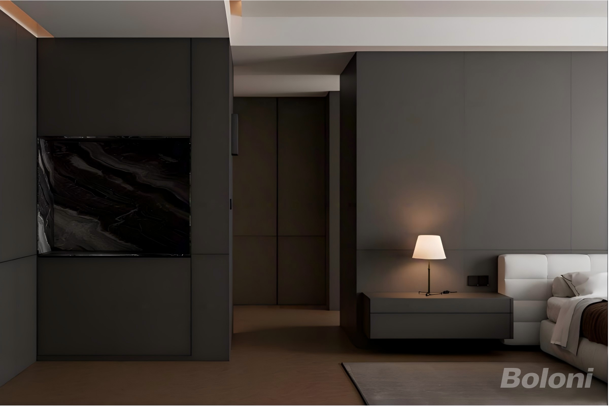 本空间主打极简深调质感,以深灰木饰面与黑金花大理石为主色调,搭配暖棕地面与米白软装,构建静谧高级的休憩氛围。色彩上暗调为基底,辅以局部暖光提亮,冷暖平衡。软装选用简约床头灯、软包床具,营造松弛睡眠氛围。设计亮点在于隐形门与一体化柜体的融合,弱化边界强化整体感,并结合线性灯与大理石纹理细节,提升空间高级感与实用性。