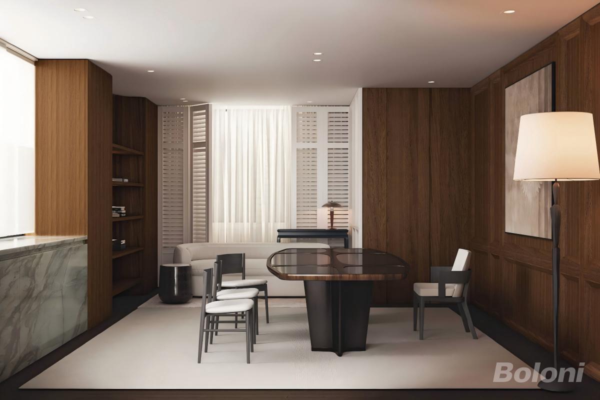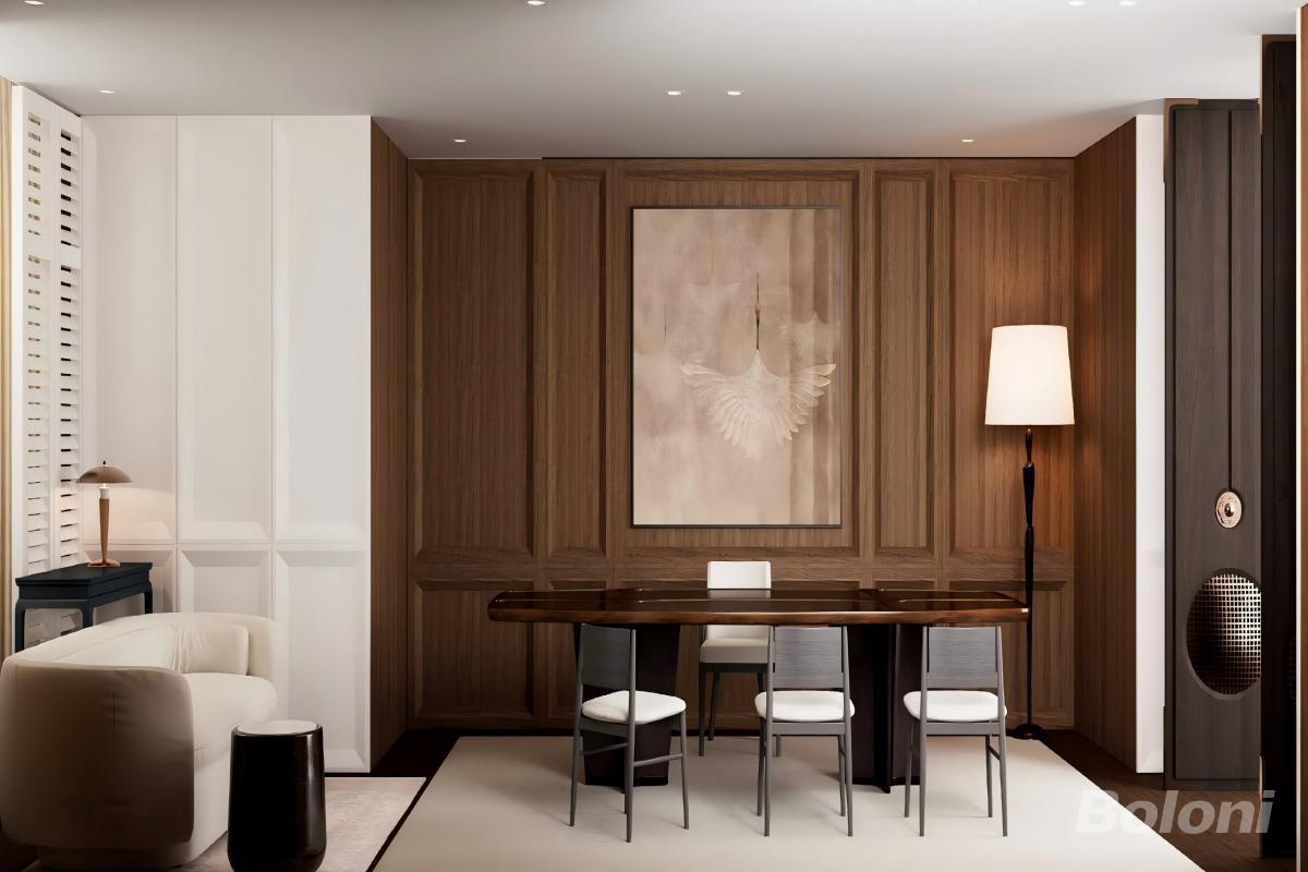温润深木饰面为基底,搭配浅灰软装与大理石,营造沉稳雅致的现代东方氛围。色彩上以木色暖调为主,辅以米白、深灰平衡层次,柔和灯光烘托静谧感。软装选用造型简约的实木餐桌、弧形沙发与艺术落地灯,搭配百叶窗与纱帘柔化光线,兼顾通透与私密。设计亮点在于木饰面护墙与隐形柜体的一体化设计,模糊空间边界,强化整体感;开放式书架与休闲区的融合,实现社交与独处的灵活切换,以克制的材质碰撞与动线规划,兼具仪式感。