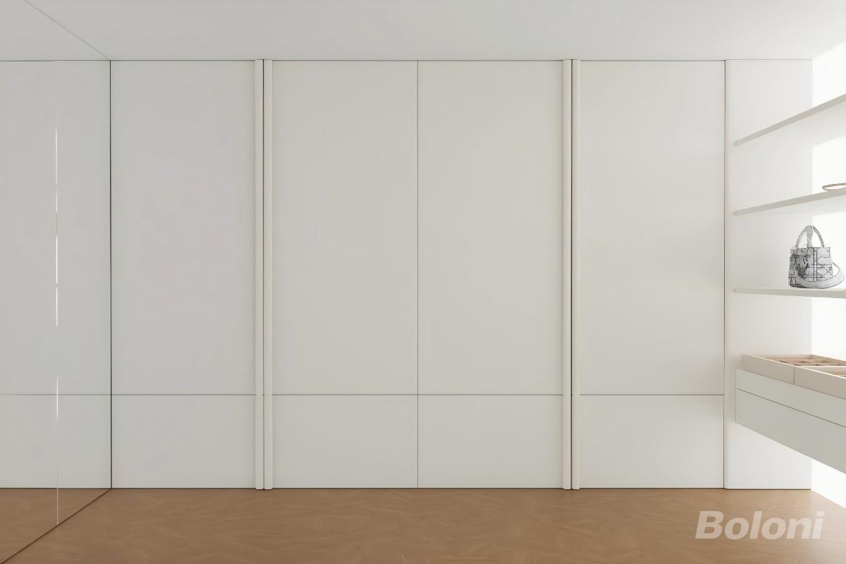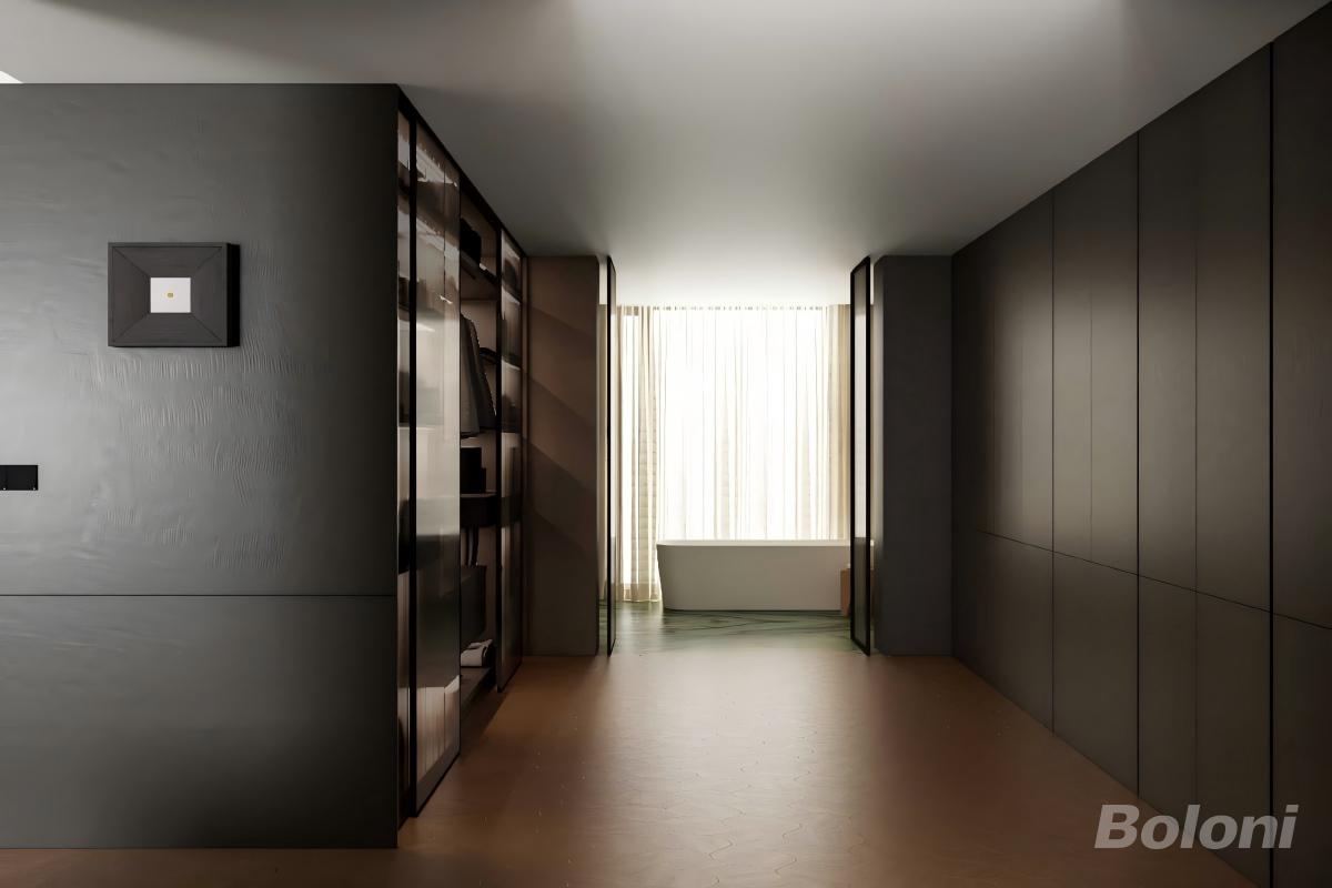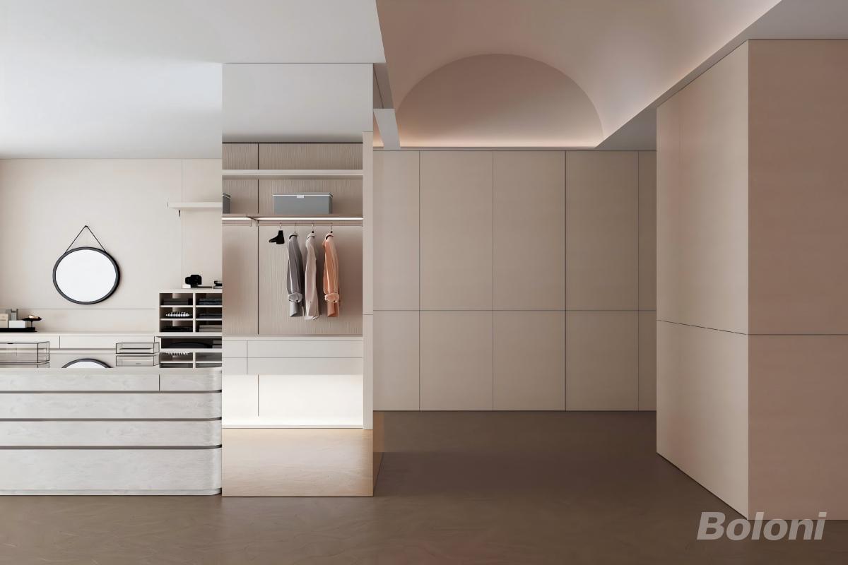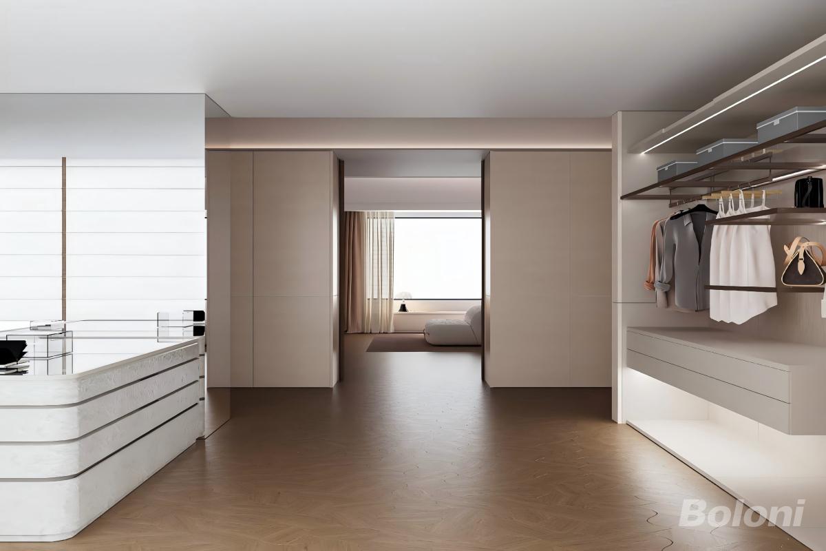 通透动线串联衣帽间与卧室,开放式玻璃层架陈列衣物与包包,嵌入式灯带提升质感。奶咖色隐形门背景墙延伸视觉,百叶窗引入柔和自然光,营造出静谧的卧室氛围。整体风格极简统一,通过材质与色彩的呼应,打造出兼具收纳与休憩的多功能空间。