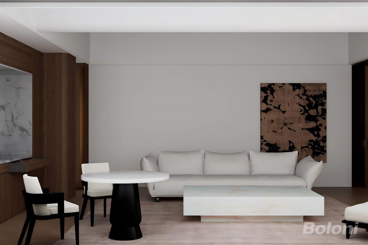 以纯白沙发为视觉中心,搭配大理石茶几与圆形餐桌,形成通透的客餐一体布局。木饰面与大理石背景墙提升质感,抽象挂画点亮空间,浅木色地面呼应整体。设计简洁克制,通过色彩与材质的平衡,打造出明亮大气、兼具现代感与舒适度的客厅空间。