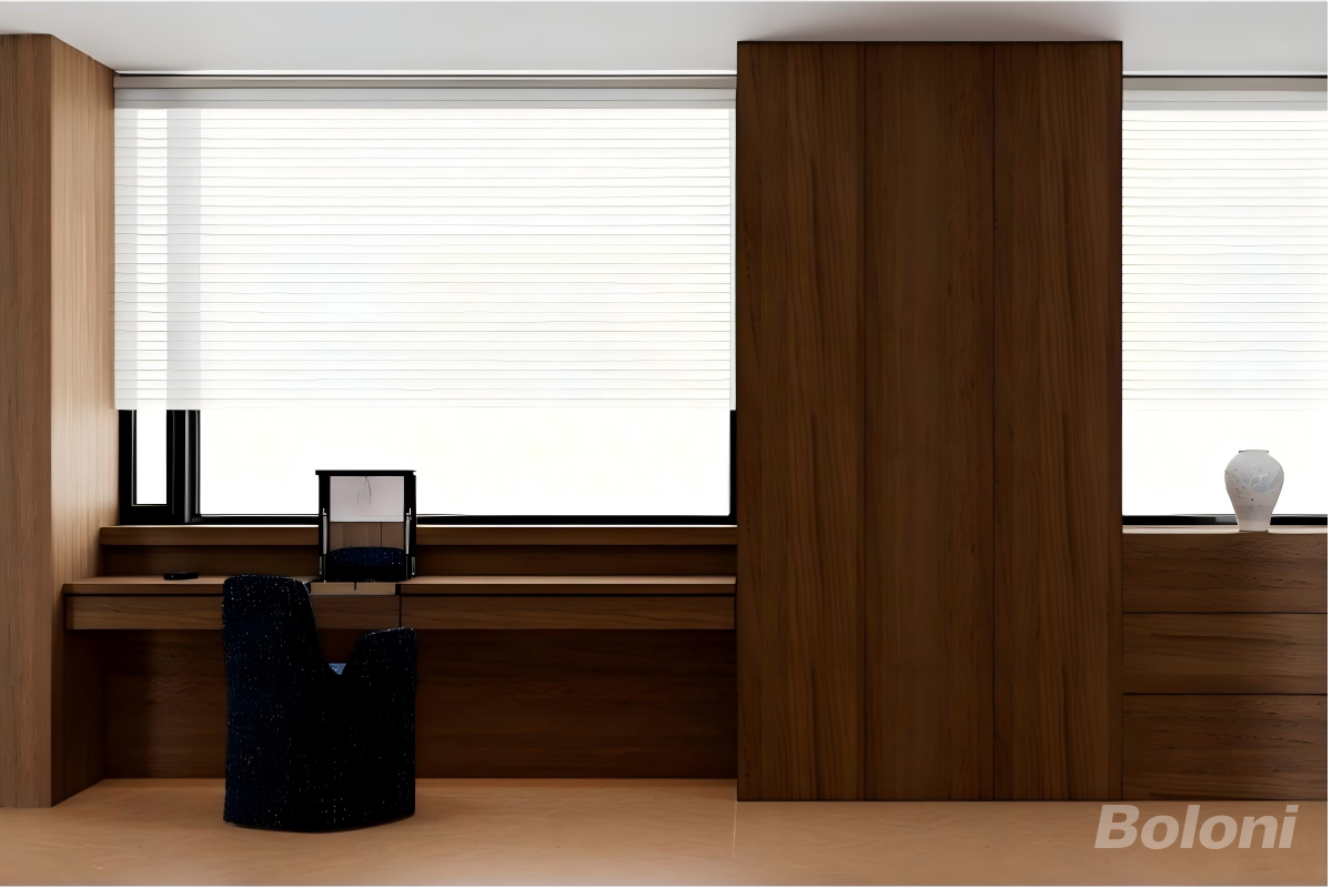 木饰面为核心元素,打造一体化窗台书桌,中间木隔断划分空间,实现功能分区。百叶窗引入柔和自然光,搭配简约座椅与装饰摆件,风格沉稳内敛,兼具实用性与设计感,营造出静谧舒适的现代办公学习空间。