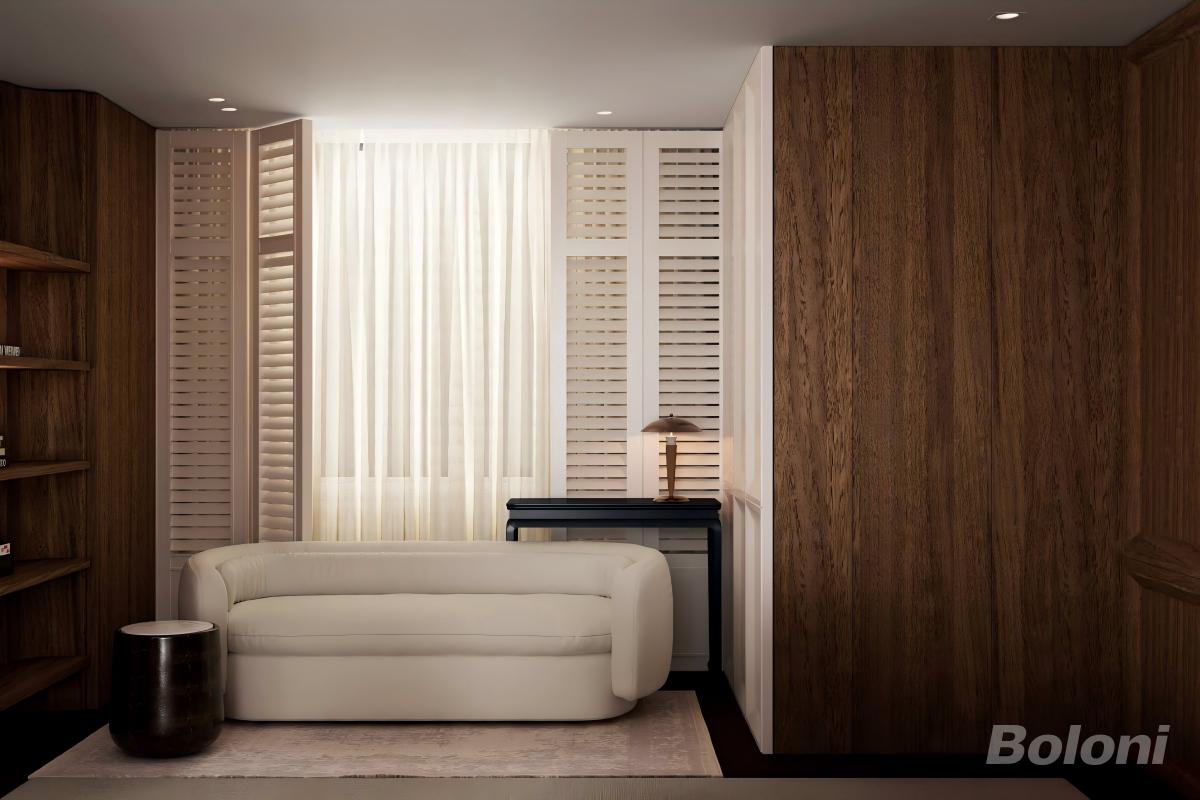 色彩上以暖木色为主,辅以米白、深黑平衡层次,柔和灯光烘托松弛感。软装选用弧形沙发、复古边几与艺术边凳,搭配纱帘柔化光线,兼顾舒适与格调。设计亮点在于木饰面护墙与百叶窗的组合,既保证采光又强化私密感,弧形沙发与开放式书架打造多功能休闲区,以克制的材质碰撞实现功能与美学的统一。