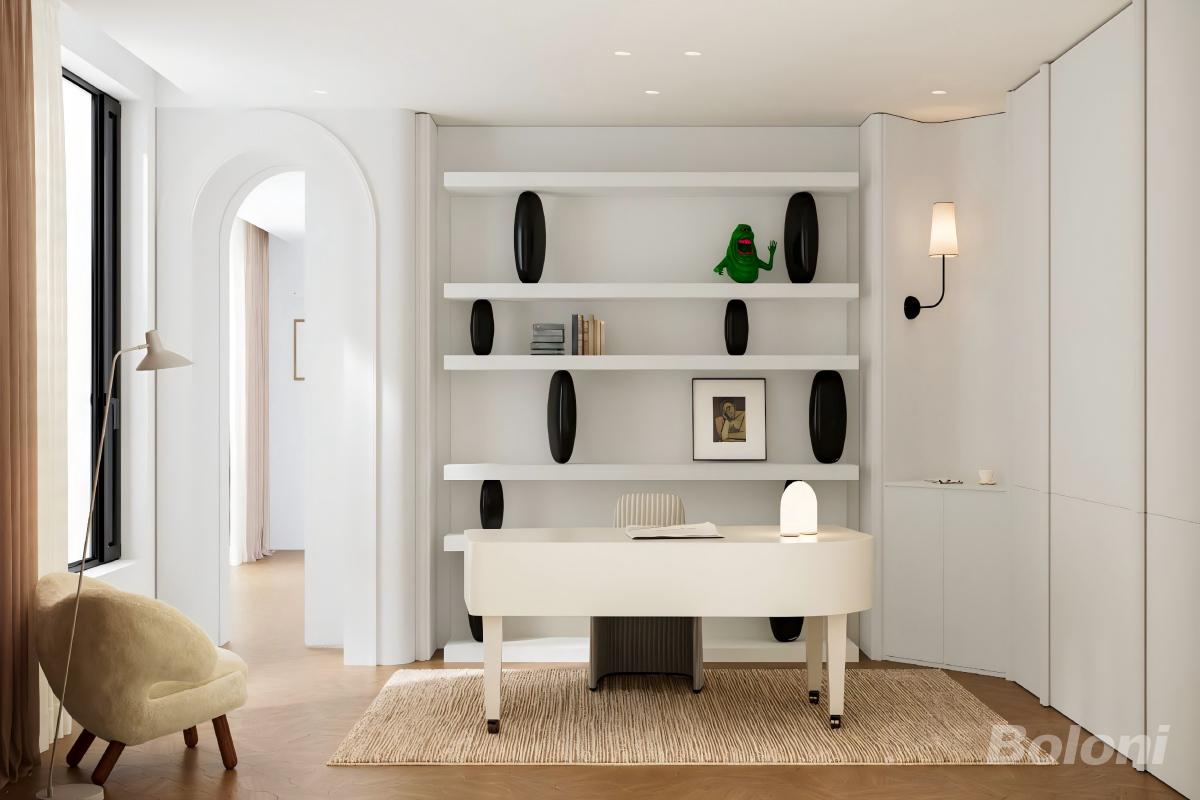 本空间以纯净白色为基调,搭配暖木色地面与奶白软装,营造明亮通透的现代书房氛围。色彩上以白为主,辅以黑、绿等跳色点缀,层次明快。软装选用弧形书桌、毛绒休闲椅与艺术摆件,搭配开放式书架,兼顾办公与休闲。设计亮点在于弧形门洞与一体化隐形柜体,柔化空间线条,强化整体感;对称式置物架与无主灯设计,提升空间秩序感与通透感,打造兼具颜值与实用性的多功能书房。