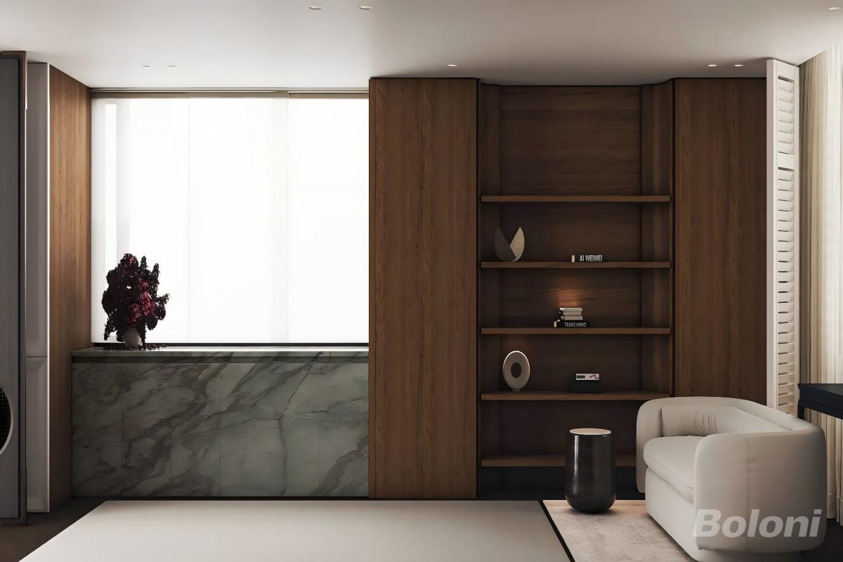 软装选用弧形休闲沙发、艺术摆件与花艺,搭配开放式书架,兼顾展示性与松弛感。设计亮点在于木饰面护墙与嵌入式柜体的一体化设计,模糊空间边界,强化整体感;大理石窗台与百叶窗的组合,既保证采光又柔化光线,实现通透与私密的平衡,以克制的材质碰撞与动线规划
