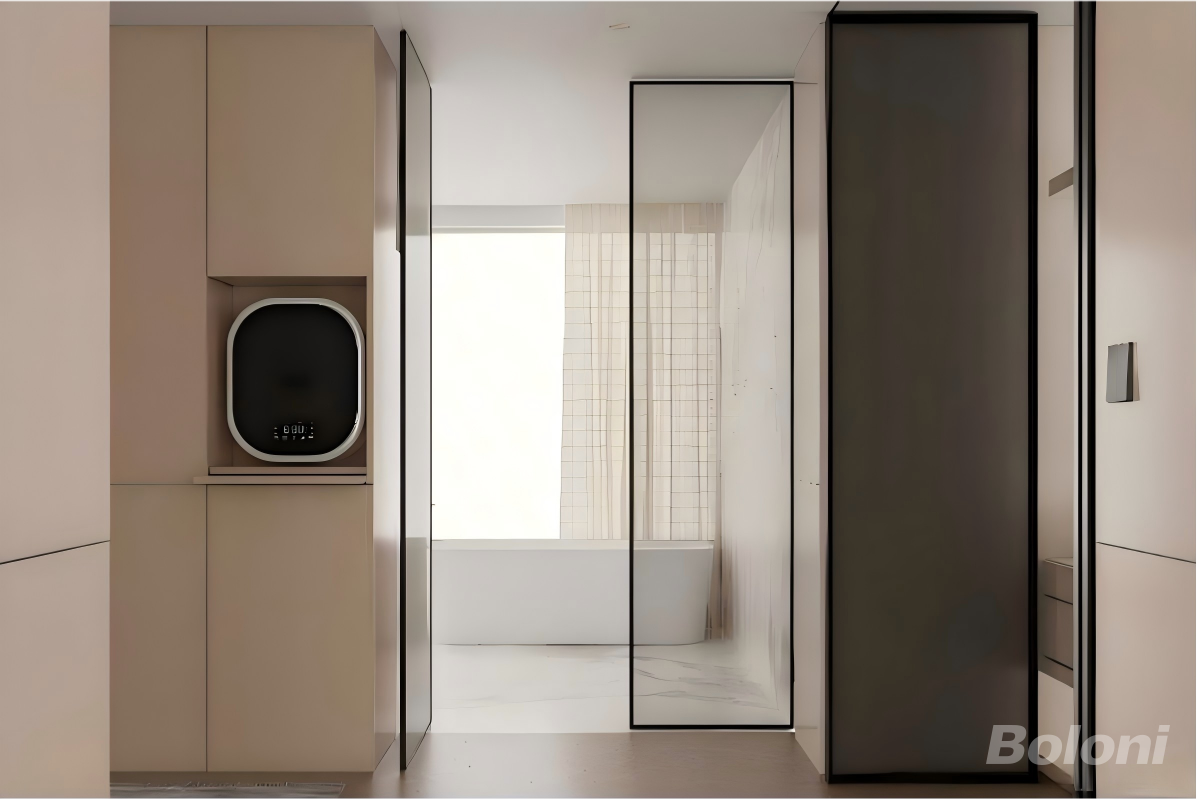 以奶咖色定制柜为核心,嵌入式迷你洗衣机实现功能与美学统一。玻璃隔断划分干湿区,通透感延伸空间,朦胧纱帘柔化自然光,营造出整洁雅致的卫浴氛围。整体设计极简克制,通过材质与色彩的统一,打造兼具实用性与高级感的现代卫浴空间。