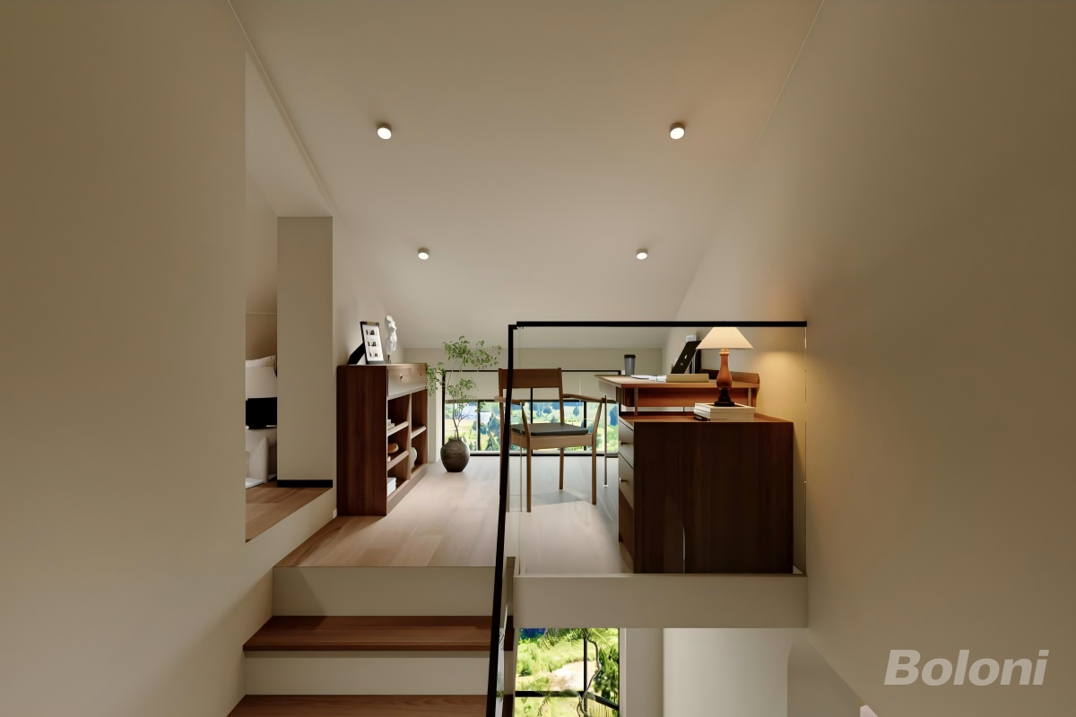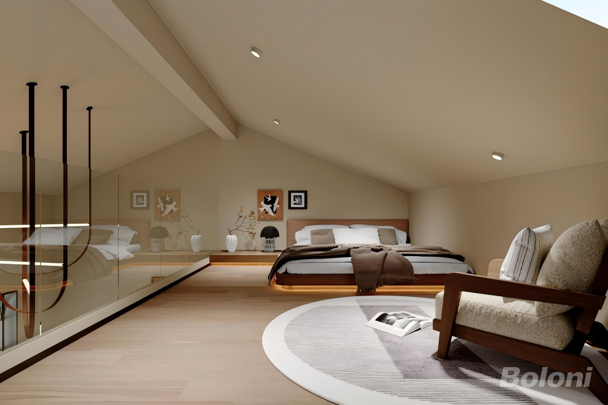 阁楼卧室以斜顶空间为载体,打造通透松弛的休憩区。玻璃护栏强化空间通透感,无主灯设计提升层高视觉感;实木床架搭配休闲单椅,兼顾休憩与放松。艺术挂画与绿植点缀空间,暖调氛围治愈,动线流畅,功能多元,适配睡眠、休闲等多元生活场景。