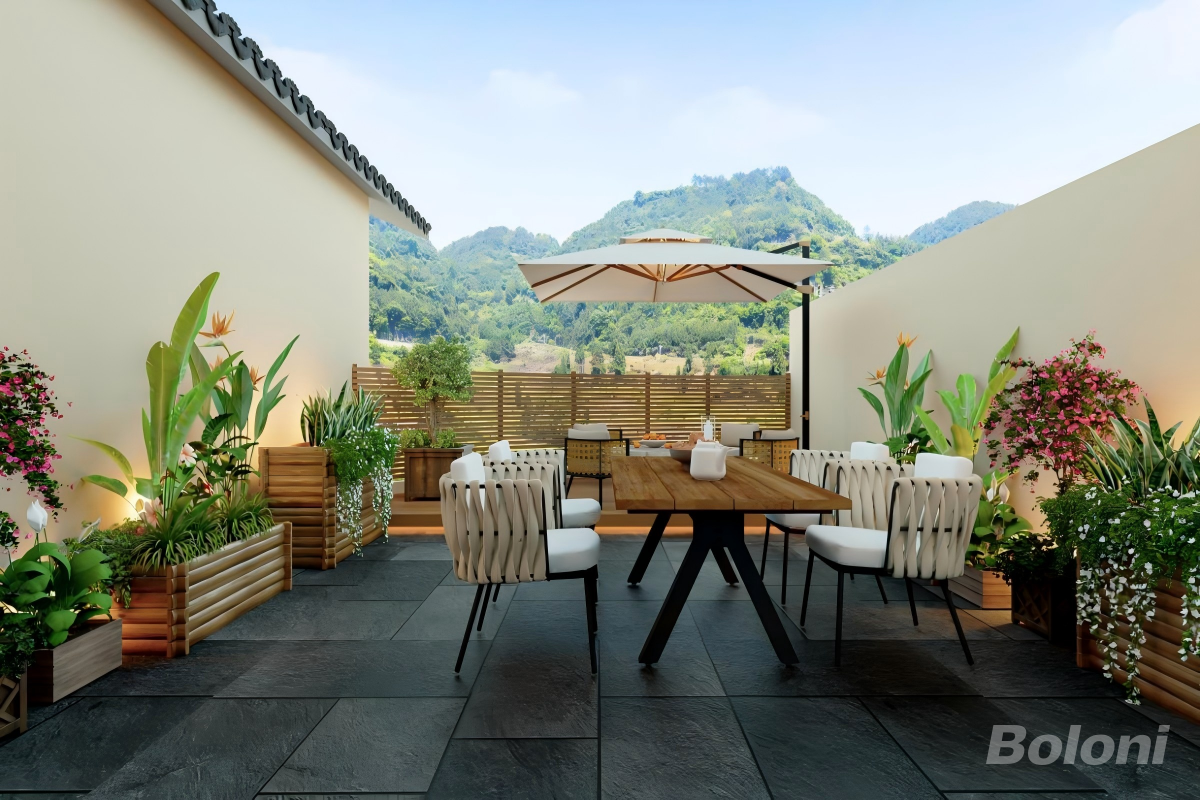 露台以自然山景为背景,打造开放式户外休闲区。防腐木餐桌搭配藤编椅,适配家庭聚餐与休闲;绿植花箱营造自然氛围,木质围栏保证隐私。遮阳伞提升实用性,石材地面耐磨易打理,整体空间通透开阔,引景入室,适配户外社交、休憩等多元生活场景。