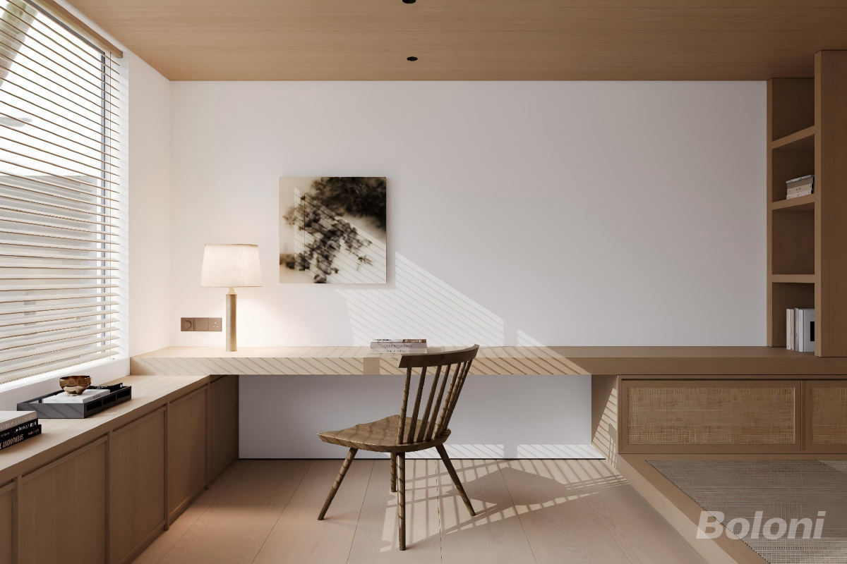 二层书房以玻璃护栏界定空间,打造通透开放的工作区。实木书桌与储物柜兼顾收纳与实用性,百叶窗引入柔和自然光,营造静谧氛围。绿植与艺术摆件点缀空间,无主灯设计提升质感,动线流畅,功能完善,适配沉浸式办公与阅读需求,风格温润雅致。