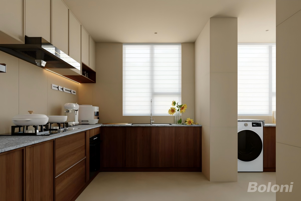 厨房打造实用通透的烹饪空间。L型橱柜布局合理,动线流畅,兼顾收纳与操作;百叶窗引入柔和自然光,提升空间明亮度。嵌入式家电提升整洁度,洗衣机区拓展功能,石材台面耐磨易打理,整体风格与全屋统一,适配日常烹饪与家务需求。