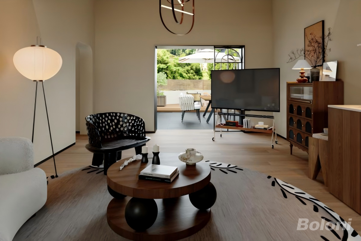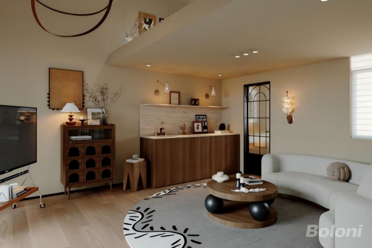 米白色云朵沙发搭配实木茶几,舒适感拉满;复古吊灯与黑白棋盘格地毯呼应整体风格,嵌入式书柜兼具收纳与展示功能。拱形垭口拓展空间通透感,绿植点缀增添生机,动线流畅,功能分区合理,适配多元生活场景。