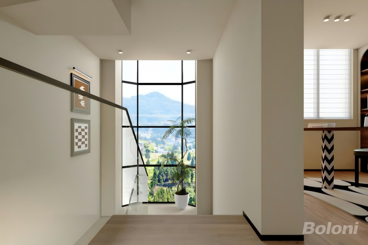 楼梯间以极简通透为设计核心,打造视觉通透的过渡空间。大面弧形落地窗引入山景与自然光,营造开阔视野;黑色扶手线条利落,串联上下层动线。艺术挂画点缀墙面,无主灯设计提升空间质感,整体风格简约大气,衔接各功能区,兼具通行与观景双重体验