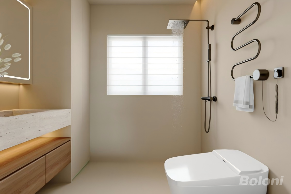 打造通透实用的卫浴空间。悬浮式岩板洗手台搭配木作柜体,兼顾收纳与轻盈感;智能马桶提升使用体验,顶喷花洒打造舒适淋浴区。百叶窗引入柔和自然光,S型电热毛巾架兼具实用与装饰性,无主灯设计搭配氛围灯,营造静谧治愈的卫浴氛围,动线流畅,功能完善。