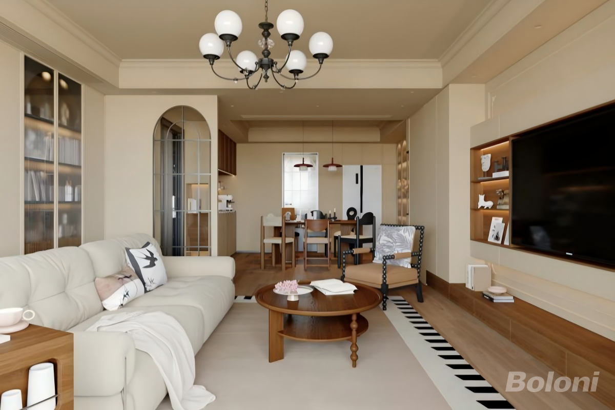 米白色沙发搭配实木茶几,营造松弛感;复古吊灯与黑白棋盘格地毯提升空间层次,拱形玻璃门划分客餐厅,保证采光通透。电视墙做嵌入式展示柜,兼具收纳与展示功能,整体风格统一,适配家庭社交与日常起居。