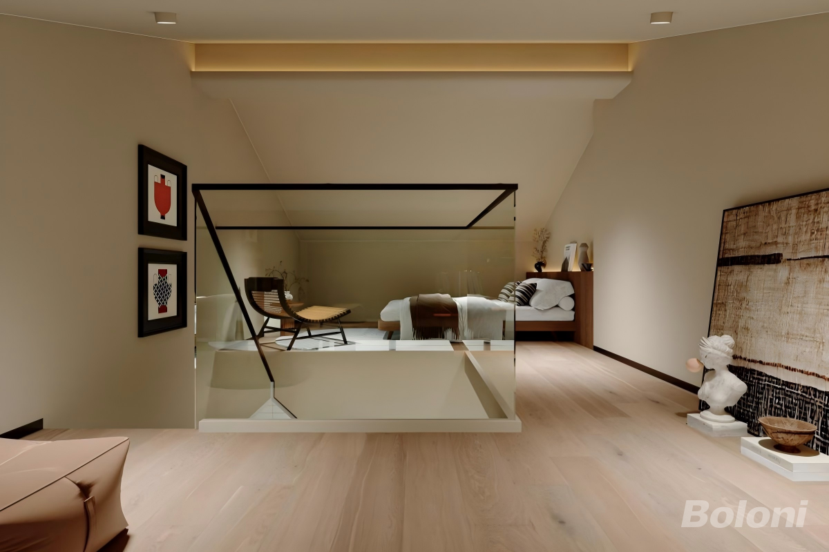 阁楼卧室以玻璃护栏划分空间,打造通透开放的休憩区。黑框玻璃既保证隐私又不遮挡采光,实木床架搭配休闲椅,营造松弛氛围。艺术挂画与雕塑摆件提升格调,暖光氛围灯烘托温馨感,空间动线流畅,功能完善,适配睡眠、休闲等多元需求,风格统一且富有层次