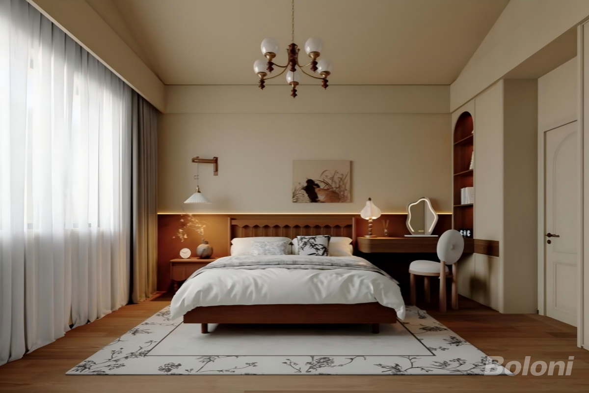 主卧打造静谧私密的休憩空间。实木床架搭配复古吊灯,营造温润氛围;双纱帘引入柔和自然光,提升空间通透感。嵌入式梳妆台与壁龛柜兼顾收纳,艺术挂画与壁灯烘托氛围,动线流畅,功能完善,适配沉浸式睡眠与梳妆需求,营造治愈居家体验。