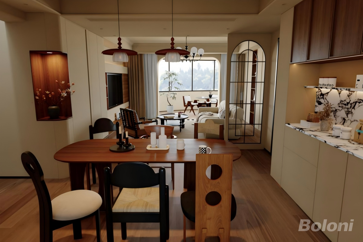 餐厅打造通透开放的用餐空间。实木餐桌搭配多把风格各异的餐椅,丰富空间层次;嵌入式餐边柜与大理石台面提升实用性,拱形玻璃门划分客餐厅,保证采光通透。复古吊灯与花艺装饰提升格调,空间与客厅、厨房动线流畅,适配多元用餐场景。