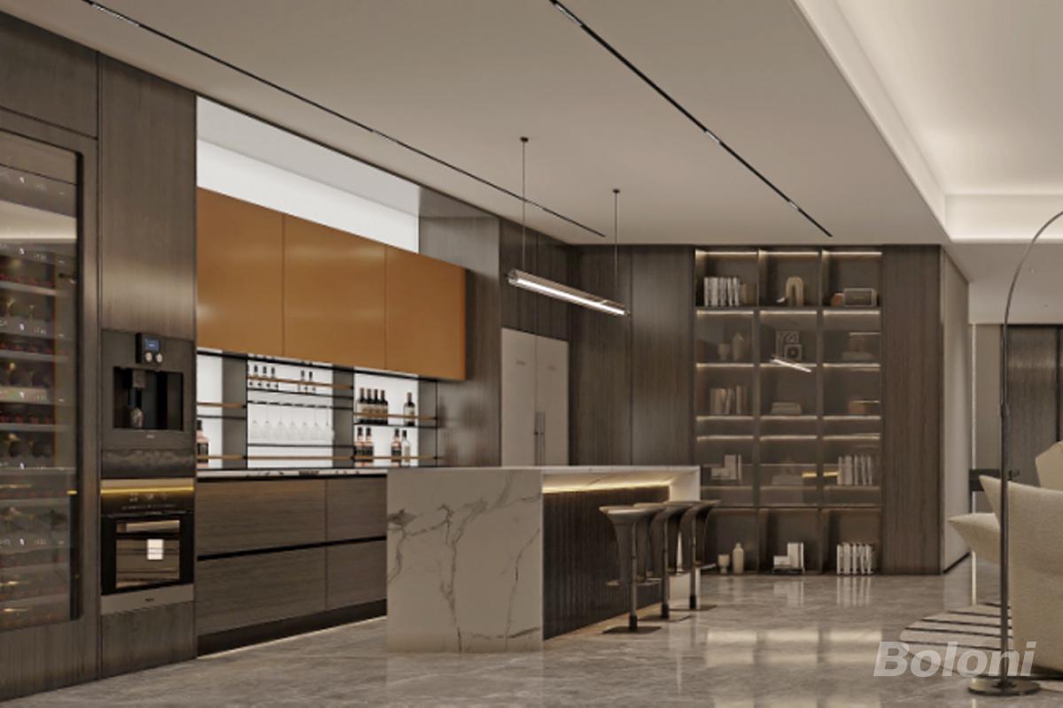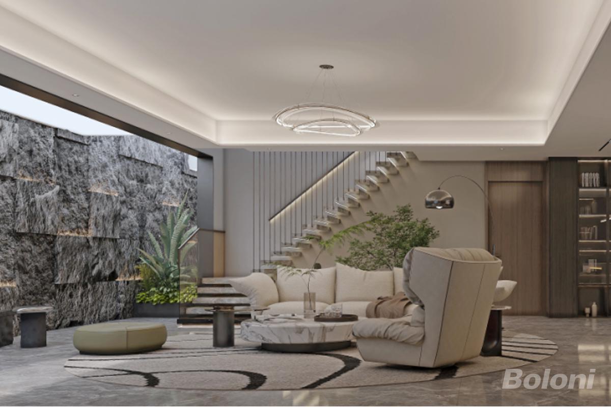 设计以家庭影院为核心,整面巨幕观影墙搭配环形艺术吊灯与弧形落https://www.bjbln.cn/upload/2026_04/afb8f88a8b2139539bb724c07286d88c.jpg地灯,营造层次丰富的光影氛围;右侧天然毛石文化墙与绿植引入自然肌理,刚柔并济中和空间的精致感;左侧玻璃展示柜实现收纳与展示的双重功能,强化空间的轻奢质感。