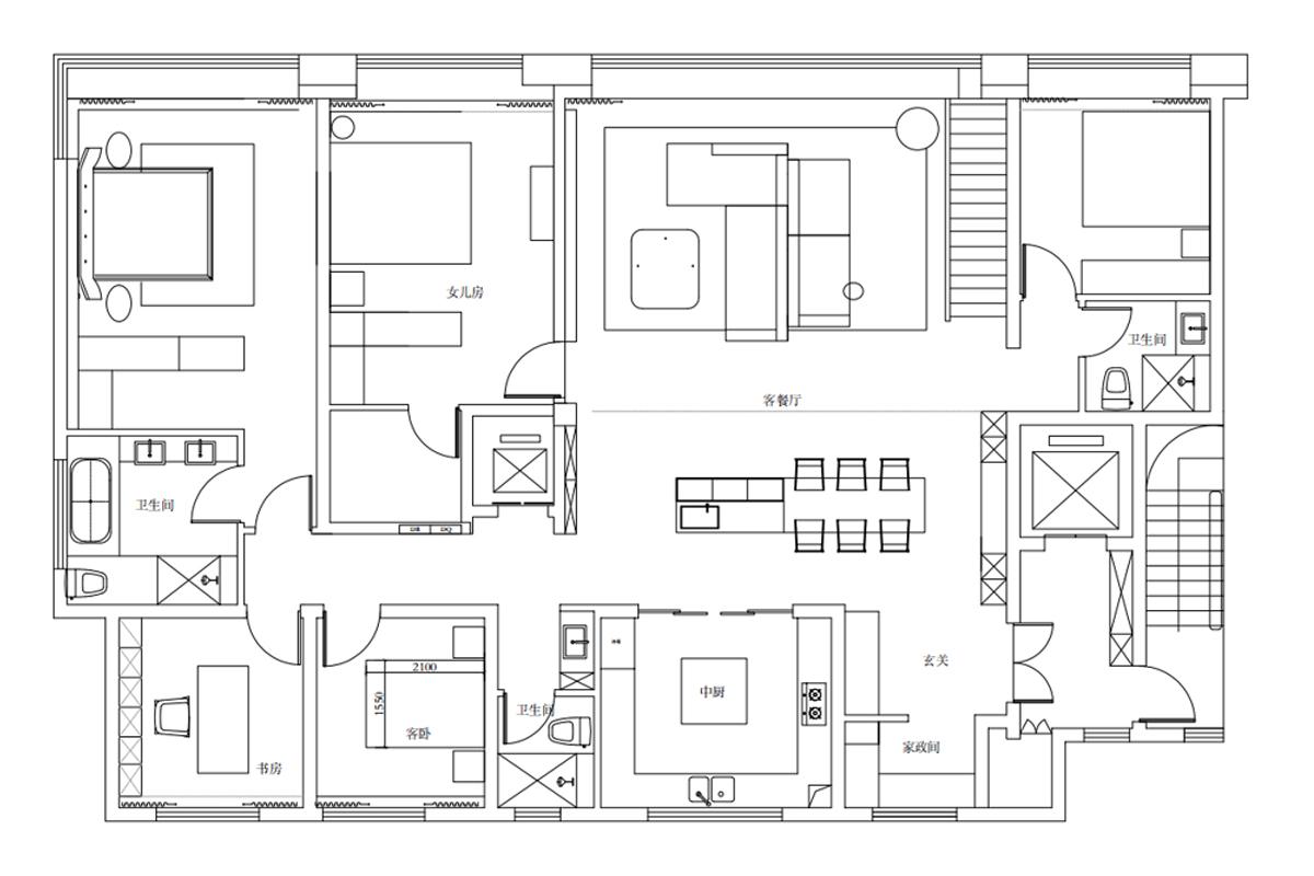 本方案以通透动线、功能分区、动静分离为核心,打造适配多代同堂的高端居住空间。整体采用客餐厅一体化的开放式布局,最大化公共区域的通透感与互动性,中厨独立封闭、西厨吧台衔接客区,实现中西双厨的功能互补。