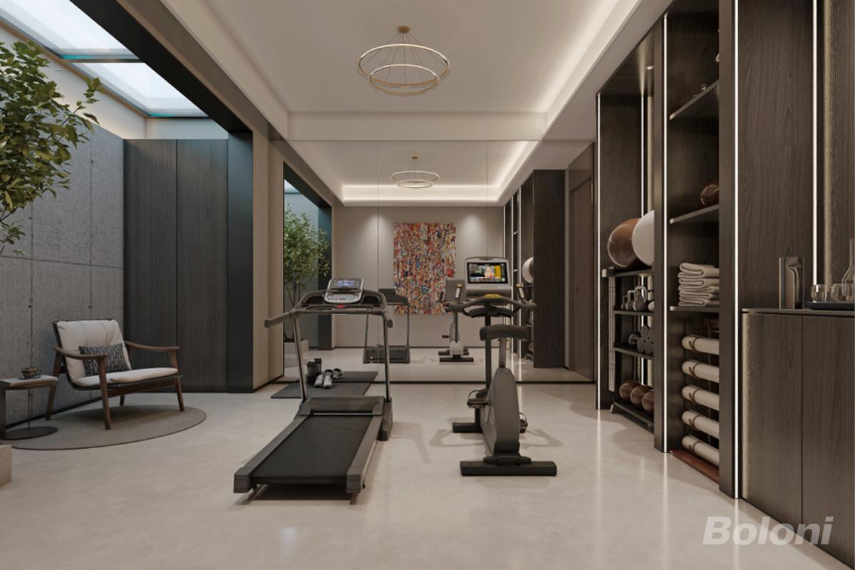 以专业健身器材为核心布局,跑步机、椭圆机等设备分区规划,满足多元运动需求;右侧定制收纳柜整合哑铃、瑜伽垫等器材的收纳,实现功能与整洁的平衡;顶部环形吊灯与无主灯设计营造柔和光影,天窗引入自然采光,搭配绿植与休闲椅,在运动之余提供放松休憩的角落。