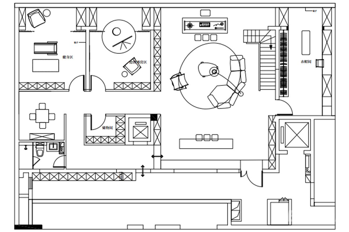 本方案以私享化、场景化、功能复合为核心,打造承载多元生活需求的复式二层空间。整体围绕家庭核心动线(楼梯)布局,将空间划分为四大功能组团:右侧紧邻楼梯设置独立衣帽间,实现衣物收纳与上下楼动线的高效衔接;中部打造开放式家庭影音休闲区,以围合式沙发为核心,搭配影音设备,营造沉浸式家庭娱乐氛围;左侧整合健身区、绘画书房区,满足运动、创作、办公等多元需求,同时配套独立卫生间与储物间,完善功能细节。