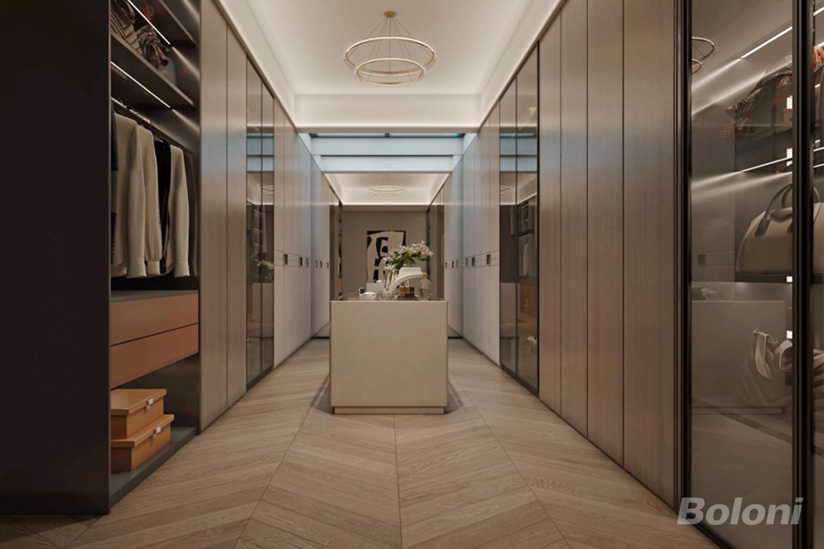 整体采用对称式布局,以浅木色柜体与玻璃柜门为主体,搭配嵌入式氛围灯,营造出通透、整洁且富有层次的视觉效果。 地面采用鱼骨拼木地板,强化空间的精致感与延伸感;中央中岛台作为视觉核心,兼具收纳与梳妆功能,提升空间的仪式感;顶部环形艺术吊灯与天窗设计,引入自然采光与艺术光影,让空间更显开阔明亮。