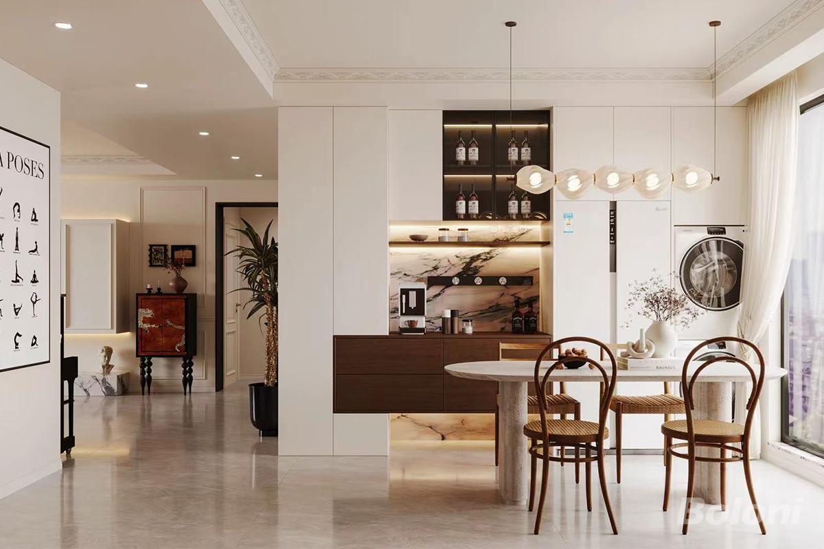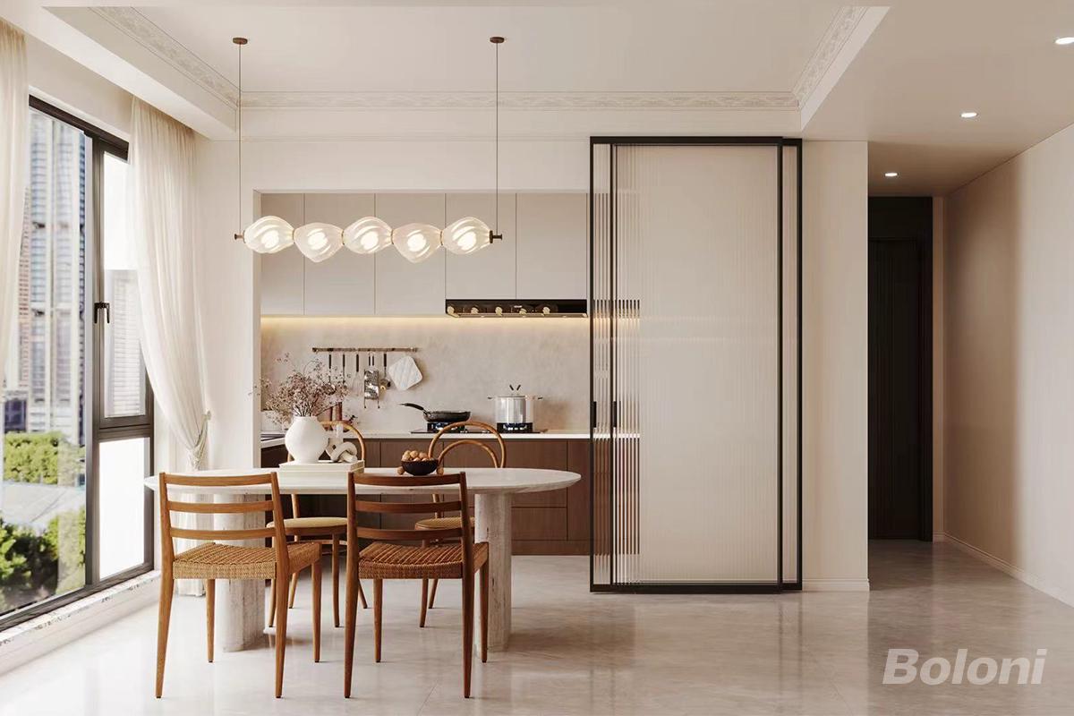 餐桌台面以天然大理石的自然灰纹,衔接地面与柜体,让空间过渡更柔和。玻璃移门的黑框、以沉稳黑色作为视觉锚点,稳定空间重心,厨房灯带以暖金提亮空间,强化法式的优雅贵气,是法式风格的标志性色彩点缀。