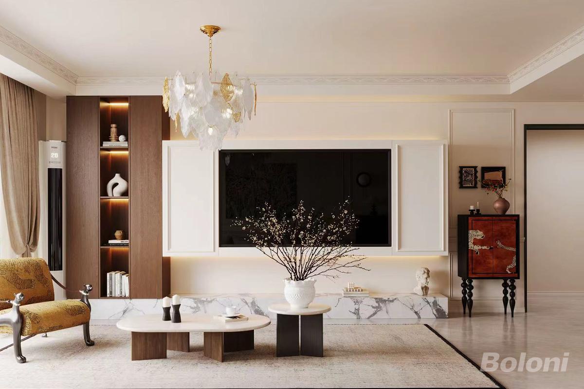 墙面、顶面、沙发主体、地毯底色统一采用低饱和暖白,搭配法式石膏线勾勒轮廓,让整个空间被柔和的暖感包裹,是奶油风的灵魂底色,同时在视觉上最大化放大了客厅的通透感。