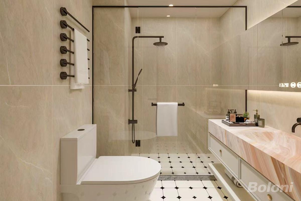 空间采用三分离干湿分离布局,黑框玻璃隔断隔绝水汽,动线高效,适配一家三口日常使用。在有限空间内实现颜值与功能的完美平衡,完美适配整体家居风格。