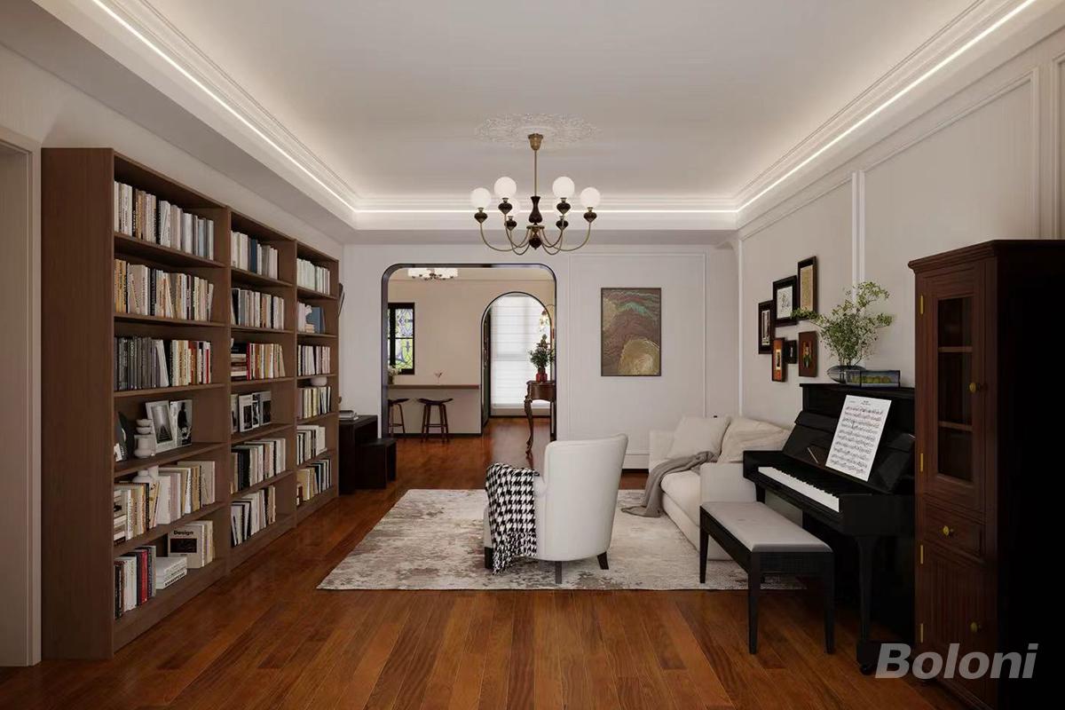 深色复古钢琴、深木色收纳柜,与地面木色形成深浅层次,沉稳压色又不显沉闷;千鸟格单椅、复古挂画的黑棕画框,用小面积深色做视觉平衡,细节更精致耐看。