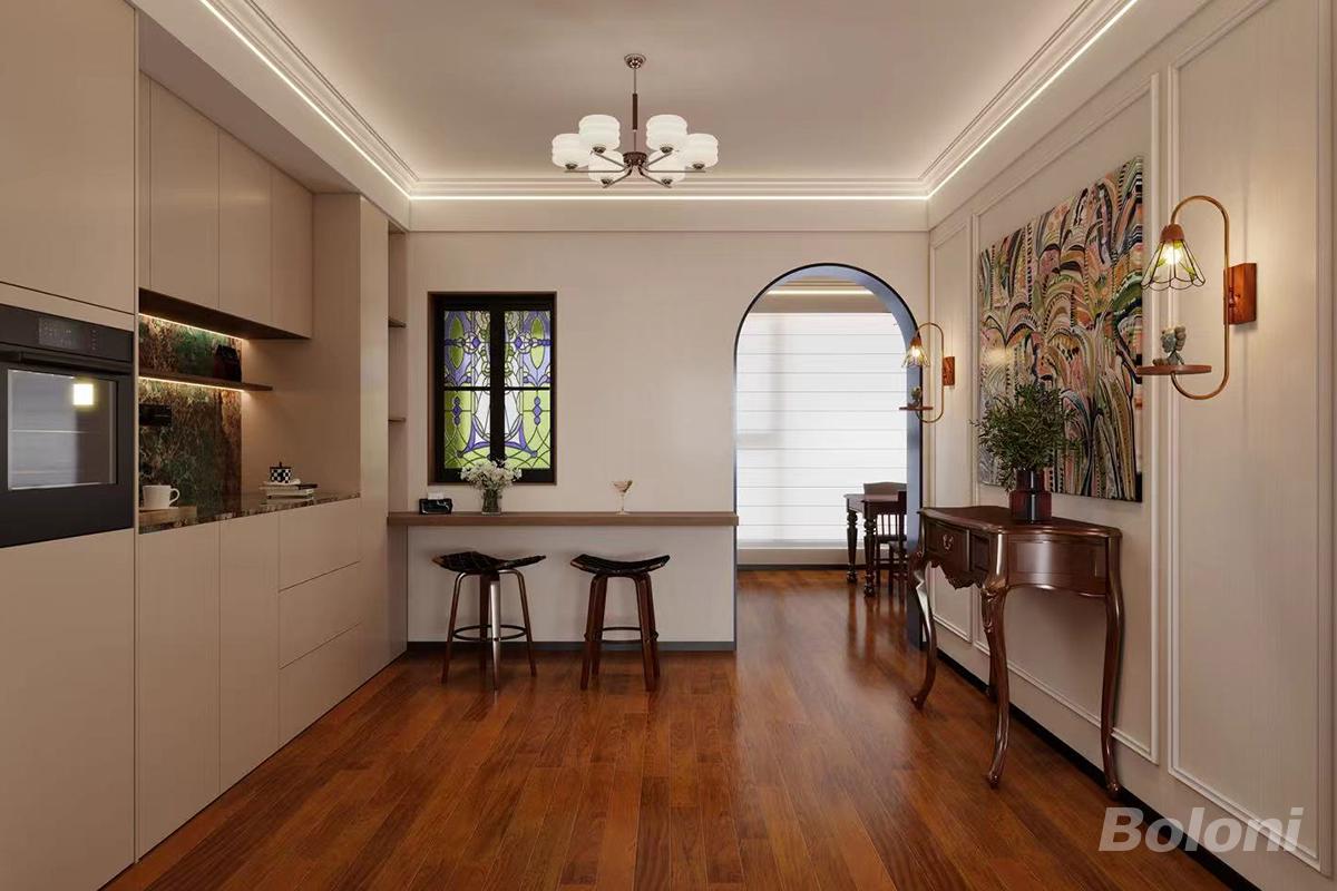 餐厅整体动线流畅,与奶米色墙面搭配精致立体线框,自带优雅柔和的底色。复古彩色花窗+内嵌吧台与高脚凳,打造惬意日常轻食小角落。日常用餐、小酌休憩都舒适治愈,复古腔调高级又耐看。