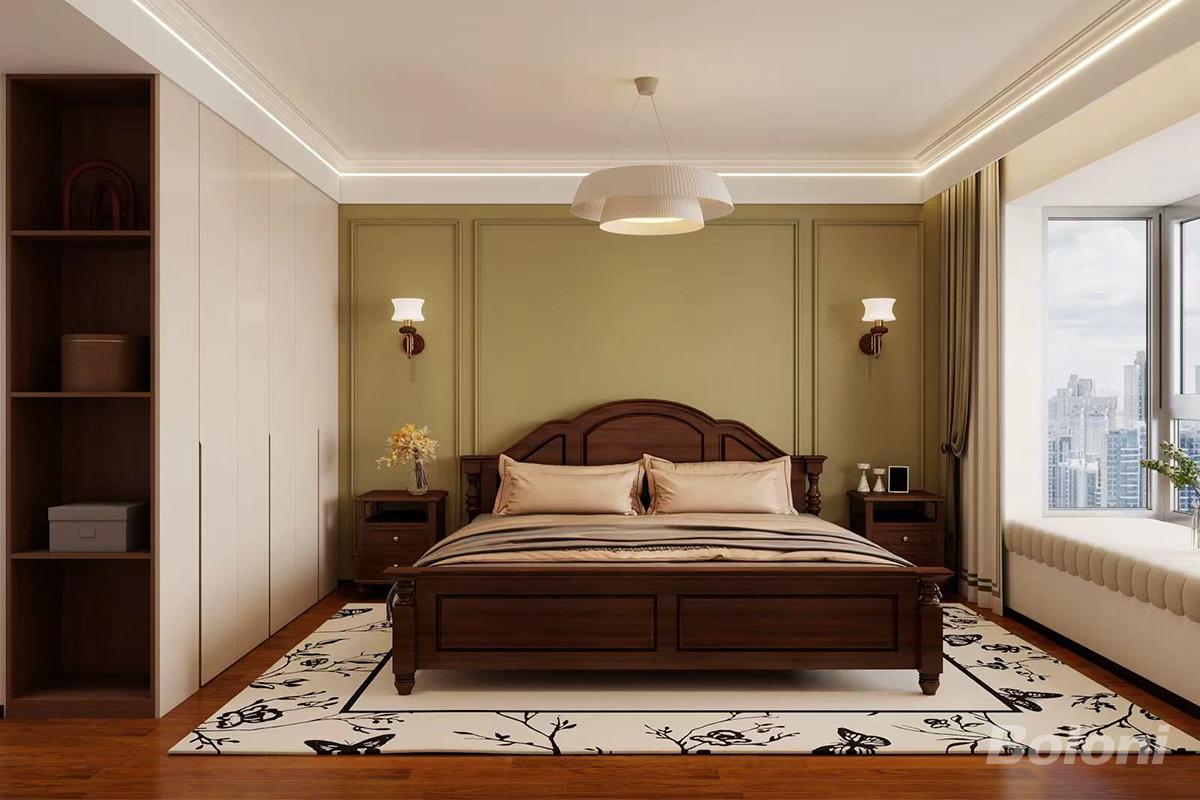 以低饱和度橄榄豆绿色作为床头背景主色,奠定沉静温柔的休憩基调;全屋通铺深棕暖调实木地板,搭配复古深色胡桃木床架与床头柜,复古厚重质感稳稳落地,冷暖平衡恰到好处,慵懒又沉静的中古卧室氛围。