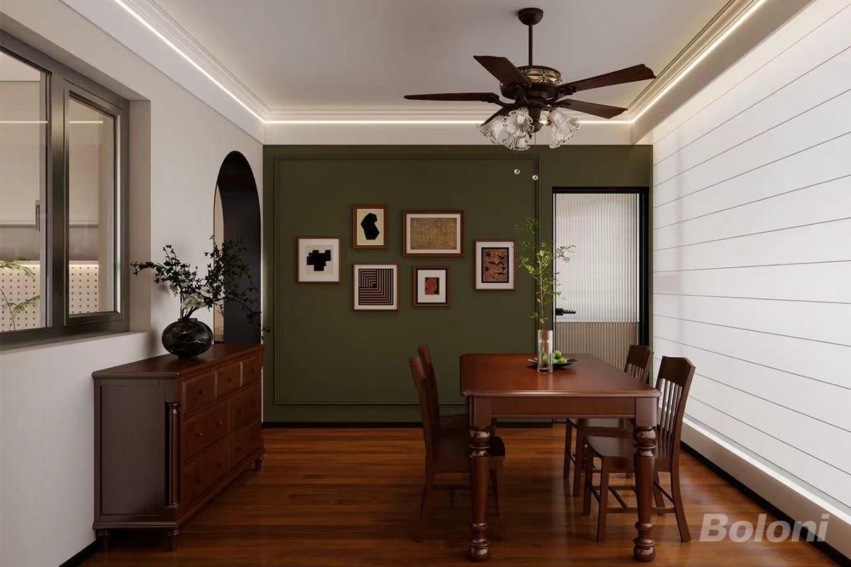 墙面错落排布的抽象装饰画,成为空间视觉亮点,增添文艺艺术气息;顶部复古木质吊扇灯,兼具实用与复古腔调,复古韵味十足,沉静治愈又久看不腻。