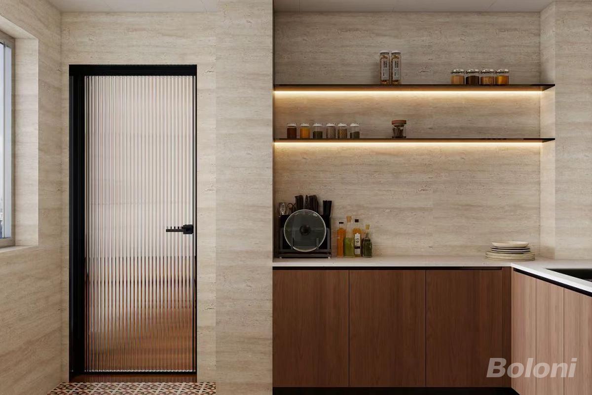 浅洞石肌理的墙面奠定柔和素雅的基底,搭配深暖木色下柜,冷暖平衡又自带天然温暖调性;长虹玻璃推拉门轻盈朦胧,柔化空间边界,还能遮挡杂乱、保证通透采光。