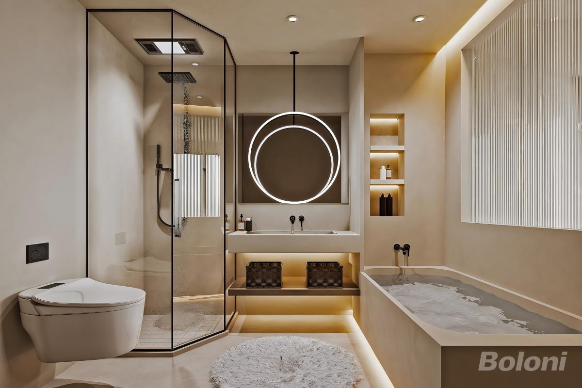 诧寂风卫生间以温润米调微水泥为基底,搭配悬浮台盆与嵌入式壁龛,线条极简利落。环形镜灯与氛围灯带营造柔和光影,玻璃淋浴房与浴缸分区清晰,整体空间通透松弛,打造兼具质朴质感与治愈氛围的卫浴空间。