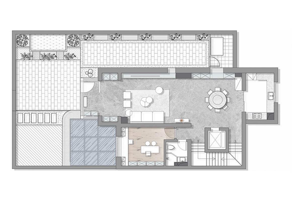 一层以客餐厅一体化为核心,打造通透的公区体验。客餐厅与户外庭院、露台无缝衔接,引景入室;一侧设置独立书房与公卫,兼顾居家办公需求。餐厨、起居与户外休闲区形成流畅洄游动线,既保障了家人的公共互动,又实现了室内外空间的自然过渡,营造舒适松弛的日常氛围。