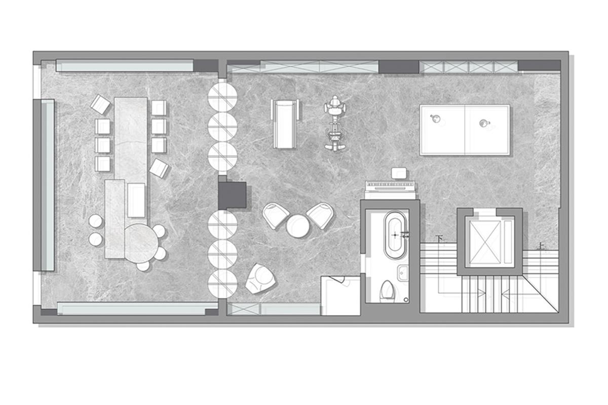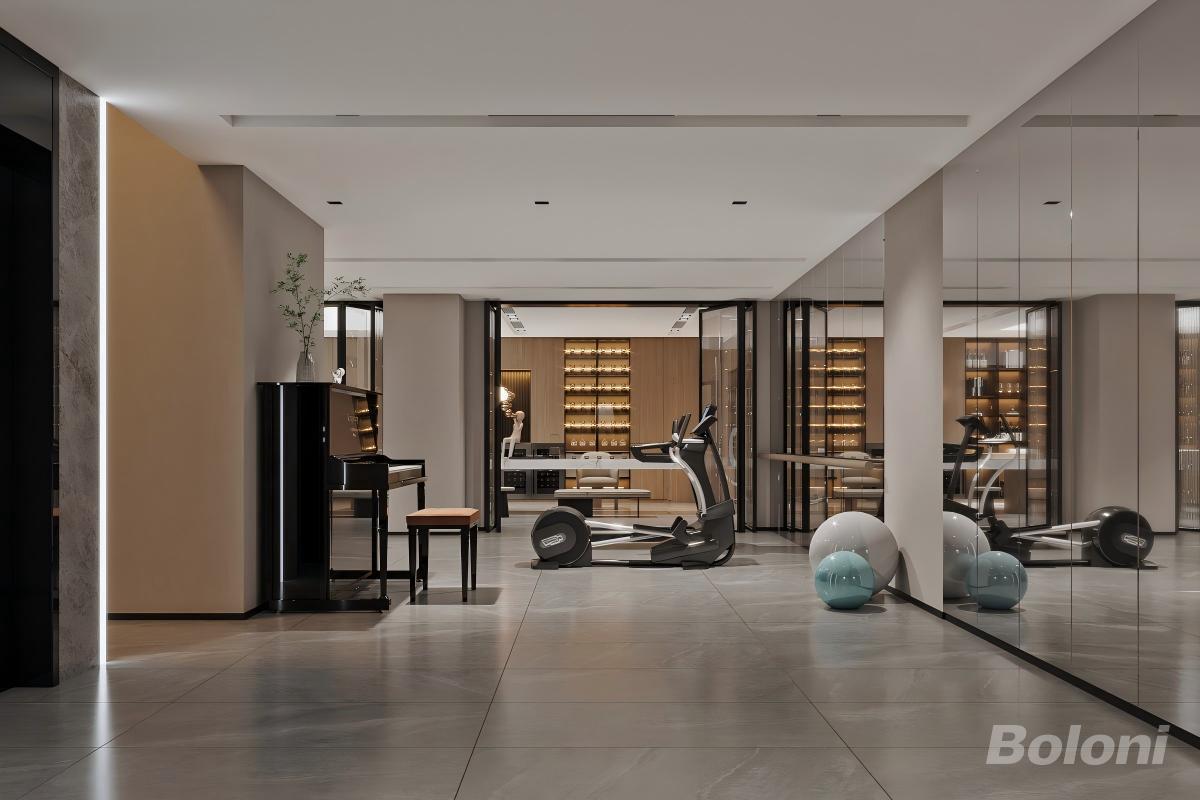 负一层以开放式复合空间为核心,打破传统功能区边界,整合社交、休闲与储物功能。左侧设置餐厨一体区,满足日常聚会与轻食需求;中部打造多功能起居与健身区,适配多元生活场景;右侧规划卫浴与楼梯间,保障动线流畅。整体布局通透开阔,最大化利用空间,营造兼具实用性与松弛感的家庭活动场域。