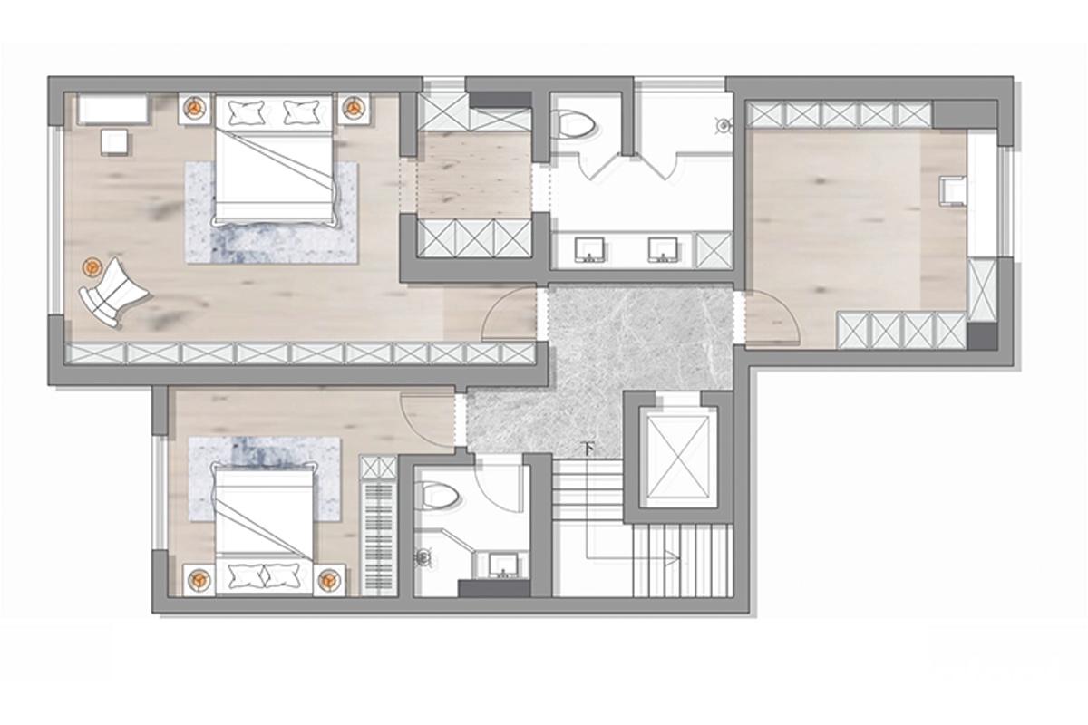 二层以静谧居住为核心,规划为纯睡眠休憩区。布局采用主次卧双套房设计,搭配独立卫浴与步入式收纳系统,保障居住私密性。公区预留书房与公共卫生间,满足居家办公与日常使用需求,整体动线清晰、动静分区合理,打造舒适纯粹的休憩空间。