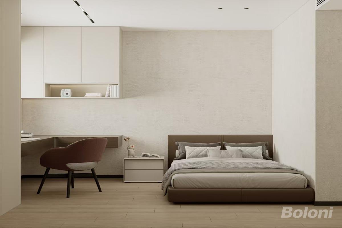 主卧极简温润设计,低柔配色沉静治愈。大理石艺术背景+整墙收纳柜,功能规整,无主灯柔光烘托氛围,营造松弛舒适、静谧安稳的休憩私域。