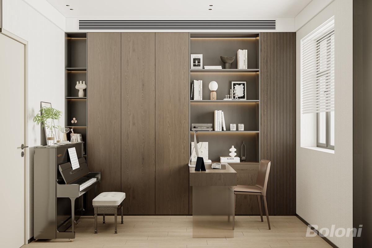 书房雅致沉静,木饰面通墙书柜质感温润,封闭柜体+开放格兼具收纳与展示功能。钢琴与书桌分区合理,采光柔和,兼具办公、阅读与休闲雅致氛围。
