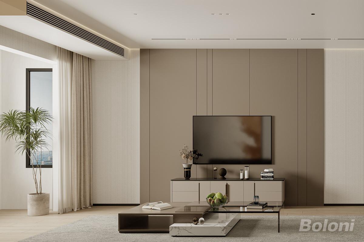 客厅整体为极简现代风,低饱和浅咖主调柔和高级。整面木饰面背景简洁大气,线条干净利落,无主灯设计拉伸空间感,绿植柔化氛围,尽显温润舒适的居家质感。