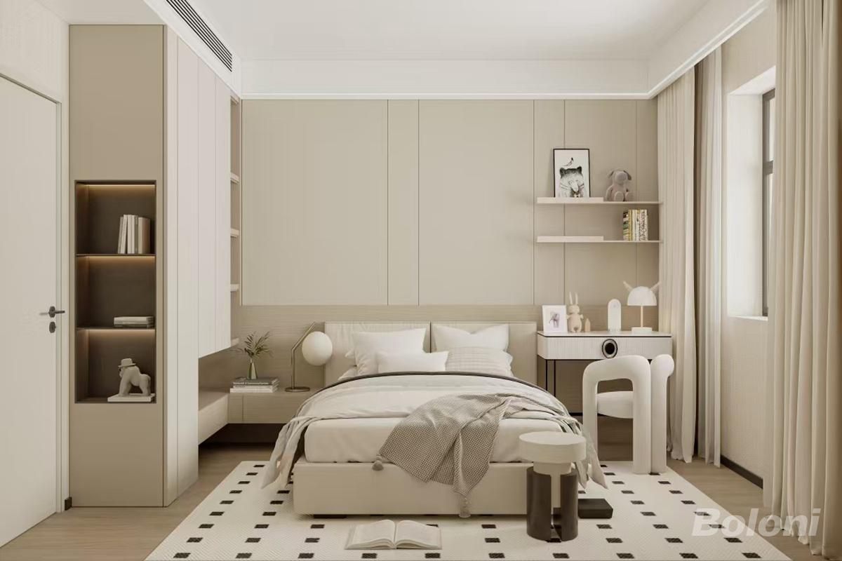 次卧整体浅柔奶油极简风,色调干净治愈。护墙板背景柔和温馨,嵌入式收纳+小巧书桌兼顾储物与学习,光线通透,打造松弛舒适的休憩小空间。