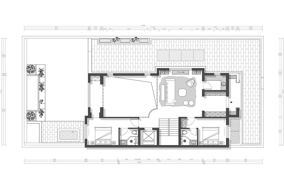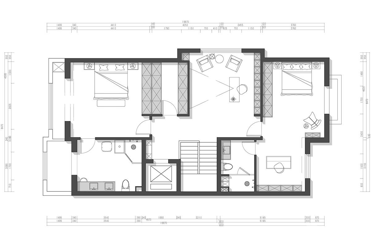 二层以纯粹的居住功能为核心,打造了一处静谧私密的家庭休息层。 整体采用「双卧套房 + 开放起居厅」的布局:南北两侧规划独立的卧室套房,均配备专属卫浴与收纳空间,保证了居住的私密性与舒适度;中间的开放起居厅,可作为家庭共享的阅读、休闲区,成为连接两个卧室的过渡空间,也为家人提供了不被打扰的互动场景。